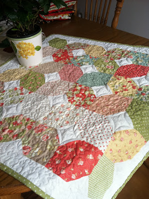It is no secret that the last few projects have all been gifts. I finally have gotten around to making myself a "strawberry treat". I loved the table topper in Camille Roskelley's book Simplify. If you haven't picked up this book it is definitely a beautifully laid out book with fantastic patterns. So I finally used my Strawberry Fields charm pack to treat myself to this beautiful table topper.